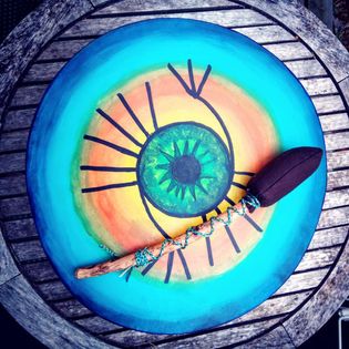 Olen opiskellut ohjaustoiminnan artenomiksi  Kankaanpään opistosta vuoden 1999 lopulla, kädentaitojen kurssitarjonnassa oli noitarummun valmistus, se silloin jäi koska olin jo valinnut tarvitsemani kurssit. Nyt sitten, vuosi sitten Hengen ja Tiedon messuilla, (jokavuotinen noitien konferenssi Helsingissä, tänä vuonna se jäi Korona-pandemiarajoitusten vuoksi), huomasin että tarjolla oli Shamaanirummun valmistus kurssi. Haa -ajattelin ja ilmoittauduin heti kurssille. Sovittuna ajankohtana huomattiin että olin kurssilla ainoa osallistuja ja sainkin henkilökohtaista ohjausta rummun valmistukseen. Rumpuun kuul uu tietenkin kehikko, se on shamaanirummussa koivupärettä, rummun kalvo on tsisnaa eli parkittua ohutta poronnahkaa. Kiinnittämiseen tarvittiin juuttinarua, hienommissa rummuissa kiinnitys tehdään jännelangalla. Rumpupalikka voi olla poron tai hirvenluuta, tässä tapauksessa se on kuivunut oksa johon on tehty villainen pallukka. Kurssilla ompelin valmiiseen rummunkehikkoon vedessä liotetun vaalean nahkapalan ja sain mukaan rumpupalikan materiaalit ja jatkokäsittelyohjeet. Kotona, kun rumpuun ommeltu nahkakalvo oli kuivunut kireäksi, maalasin rummun akryyliväreillä, sekä rummun kehikon että kavon johon piirsin oman kuvion. Kun maali oli kuivunut sivelin rummun pintaan mehiläisvahaa. Näin rumpu säilyy kauemmin hyvänä. Rumpupalikkaan suunnittelin värikkään revontulikuvion värikkäistä villahahtuvista, jota minulla piti olla varastossa mutta ei sitä sitten löytynyt vielä. Letitin vaillalangasta nyörin jonka kiedoin rumpupalikan ympäri koristeeksi. Rummuttelin kokeeksi rumpua ja kyllä se tarpeeksi hyvin soi.